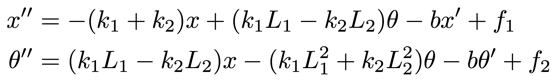 If G is the center of mass of the transversal section of the car, we consider x the elevation and theta the swing of the car with respect to the center of mass, L1 and L2 are the distances from the front and back wheels, and k1 and k2 are the stiffness of the front and back suspension with shock absoption coefficient b, then the equations of the confort of a car are: