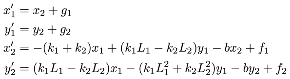 x2' = -(k1+k2)*x1 + (k1*L1-k2*L2)*y1 - b*x2