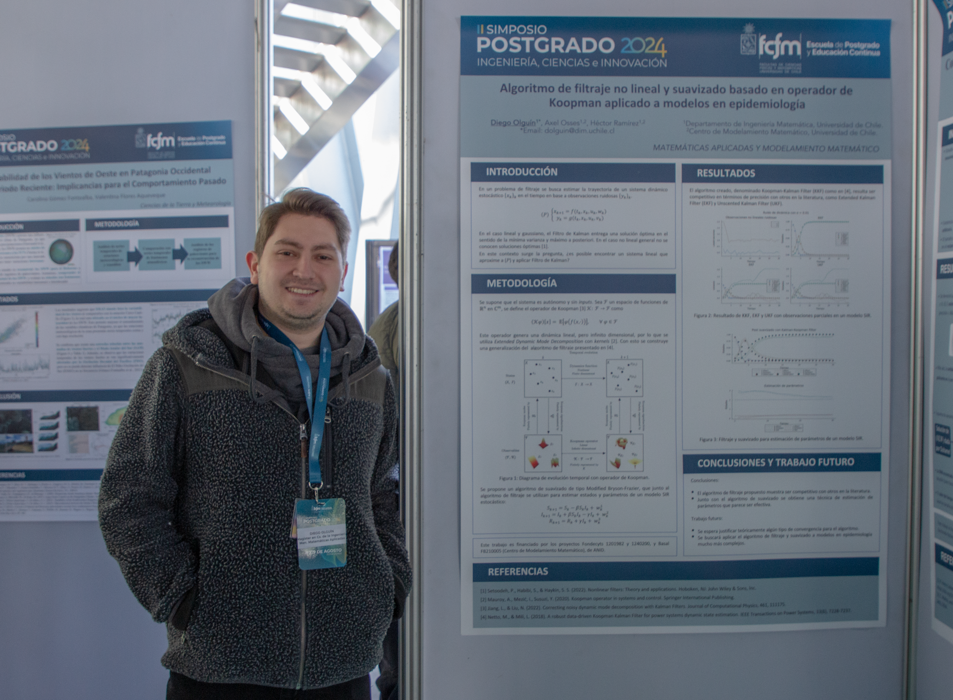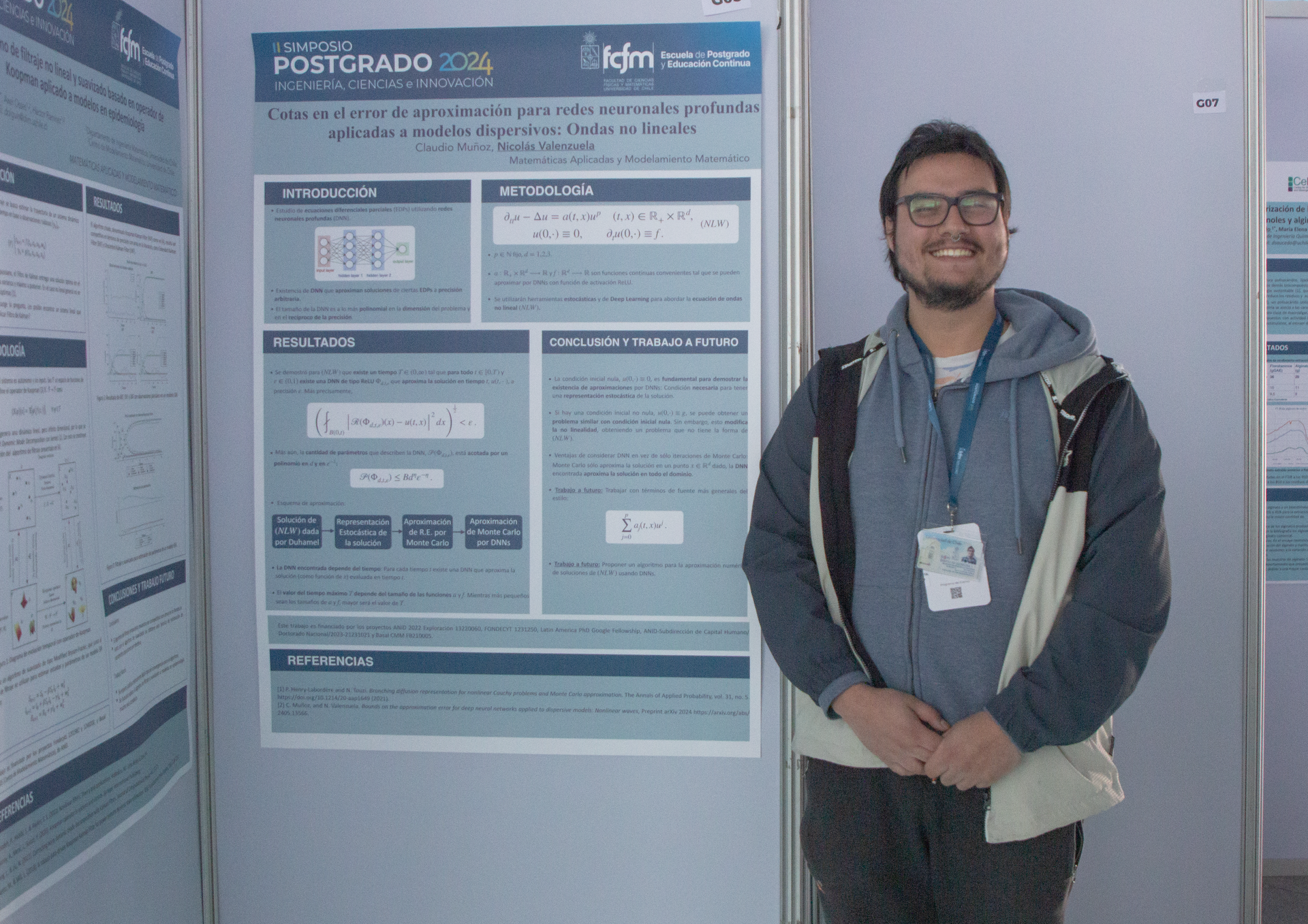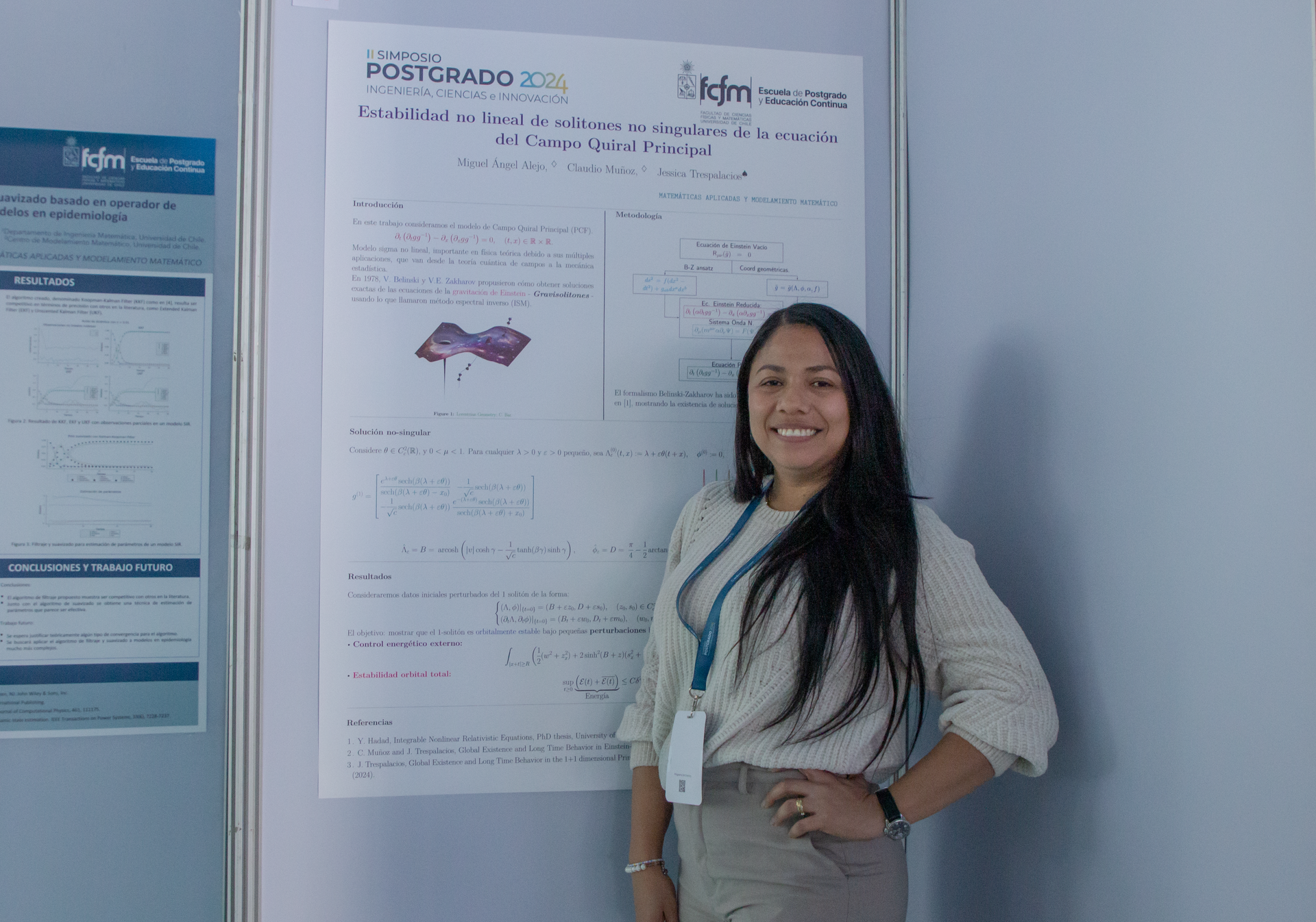 En esta ocasión contamos con la participación de cuatro estudiantes de nuestro Departamento, quienes presentaron sus trabajos, tanto en la modalidad Posters, como en la modalidad Tesis en un minuto: Benjamín Jauregui, Diego Olguín, Nicolás Valenzuela y Jessica Trespalacios, siendo el estudiante Benjamín Jauregui Premiado con el segundo lugar en la modalidad poster, logro por el cual le enviamos nuestras felicitaciones.