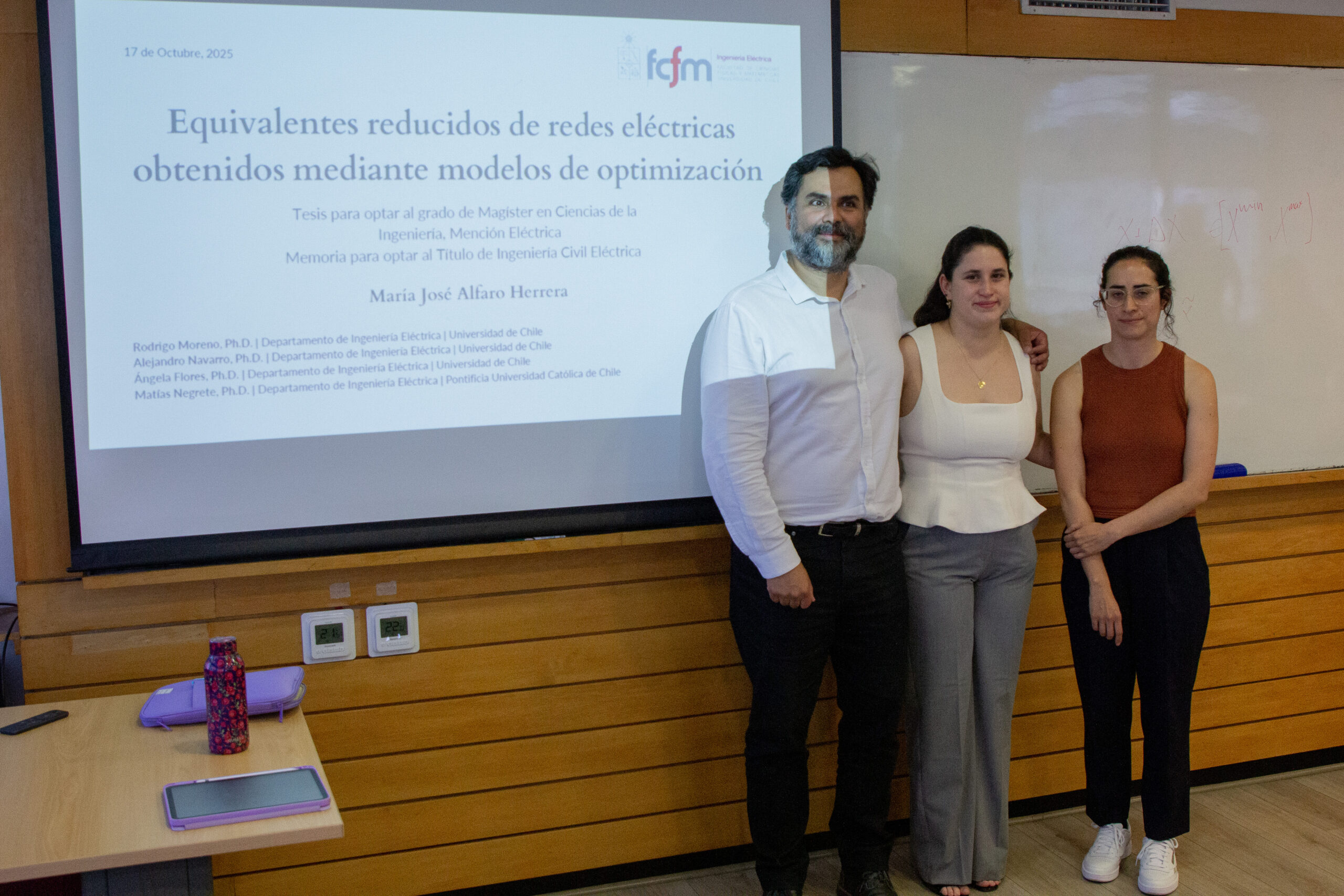 El viernes 17 de octubre, a las 14:00 horas, en la sala de seminarios Felipe Álvarez del quinto piso del Departamento de Ingeniería Matemática (DIM), se realizó la defensa de tesis de doble titulación de María José Alfaro Herrera, quien culminó con éxito un destacado recorrido académico que inició en el DIM y que hoy la consagra como Ingeniera Civil Eléctrica y Magíster en Ciencias de la Ingeniería con mención en Eléctrica.