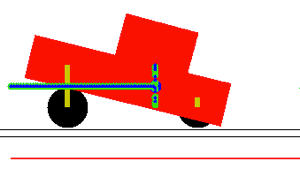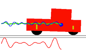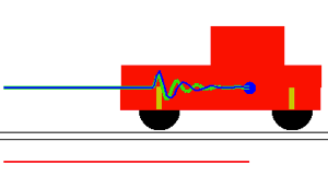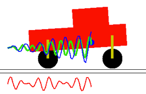 We first consider in the following animation the car driving on an oscilating soil (g1=g2=0 and f1=f2=oscilating function showed in red in the animation), without shock absoption (b=0).