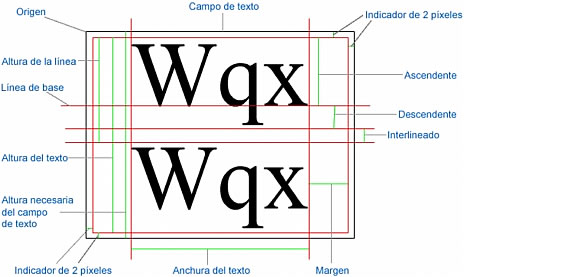 Las medidas ascent y descent proporcionan, respectivamente, la distancia por encima y por debajo de la línea de base para una línea de texto. La línea de base para la primera línea de texto se coloca en el origen del campo de texto más su medida ascent.