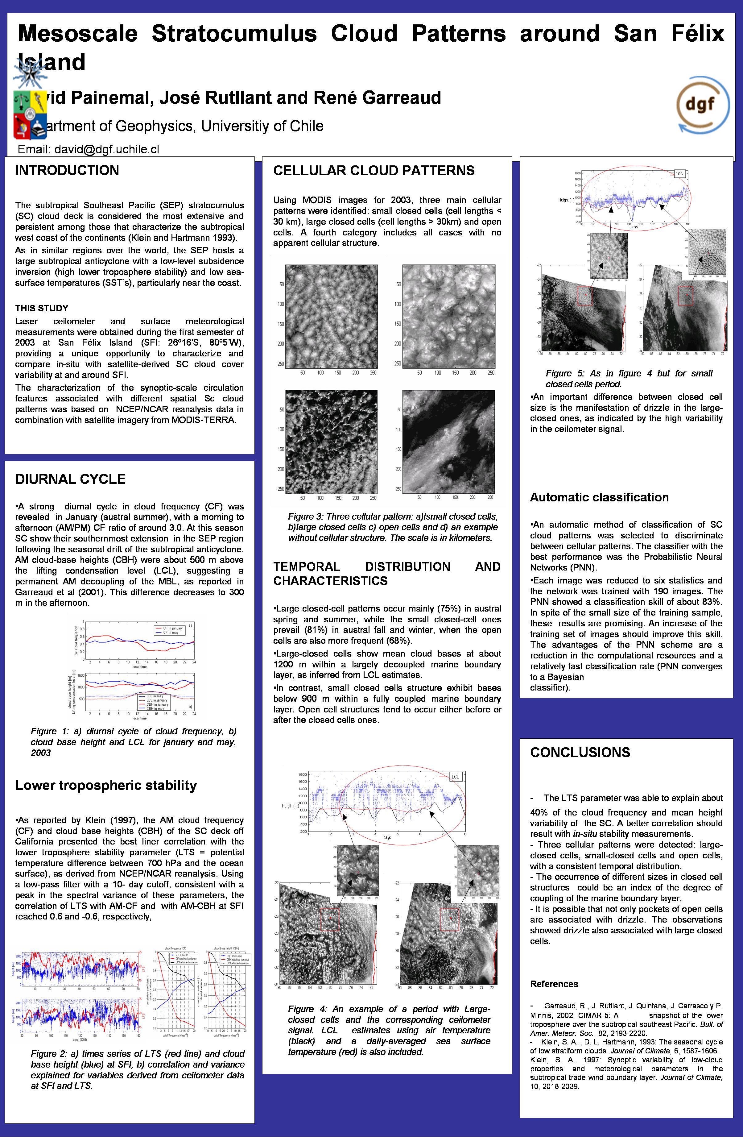 Painemal, D., Rutllant, J., Garreaud, R.: Mesoscale Stratocumulus Cloud Pattern around San Félix Island. 14th conference on interaction of the sea and atmosphere, AMS, Atlanta (USA), January 2006 (pdf, poster)
