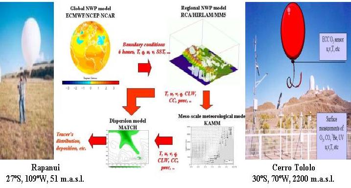 Our aim is to identify the mechanisms that explain the O3 spring maximum at Tololo. Also, we want to assess the relative importance of the mechanisms responsible for the transport of O3-rich air from intrusion areas, where STE occurs, to the Tololo site, i.e., advection, large-scale subsidence and turbulent mixing. To identify characteristic patterns of STE, a climatology of typical air-masses arriving at Tololo will be built-up on the basis of composite analyses of reanalysis data using potential vorticity (PV), water vapor and the like as STE proxies. Further details will be identified by using high-resolution (ca. 0.1º, 3 hourly) climatological fields, dynamically interpolated from reanalysis data for nine months in the years 1997, 1998, 1999 and 2000, which cover typical meteorological situations over the Tololo area, including El Niño and La Niña years. In situ vertical soundings of O3 will be carried out three times a day, daily during a 10-days long campaign in the spring of 2004 at Tololo. Complementarily, meteorological soundings will be performed during the campaign. Also, measurements of a beryllium isotope (7Be), sampled for 24 hours every three days along one year, and carbon monoxide (CO), continuously sampled during the campaign, will be concurrently performed in order to discriminate the origin of air masses. Regional and meso-scale numerical simulations of stratospheric intrusions as expressed in dynamical variables (e.g., PV) and in transport of an O3-like tracer will be performed. These simulations will be done for typical spring conditions as identified by the climatological data and for selected events according to the data collected during the campaign. Meteorological models will be used to produce dynamically interpolated three-dimensional (3-D) regional and meso-scale meteorological fields, which will drive a 3-D Eulerian transport model that will simulate the intrusion and subsequent dispersion of an O3-like tracer subject to photolysis and dry deposition. The simulations will be evaluated against in situ and available satellite measurements of O3, water vapor and other relevant STE tracers.
