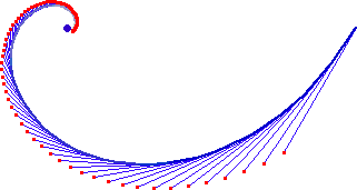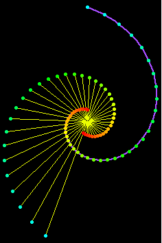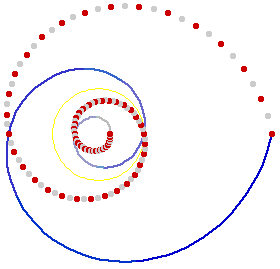 Las figuras de arriba muestran el rastro de los insectos que se persiguen, resultando espirales de 60, 45 y 54 grados respectivamente. Las figuras de abajo muestran también las lineas de dirección de cada insecto, podemos apreciar que cada línea es tangente a los espirales y forma parte un polígono semejante al original, luego, la espiral formada debe ser una equiangular. Consideremos ahora que el lado del polígono mide una unidad y se divide en Aplicando la ley de cosenos: ![]() ![]() ![]() Donde En esta ecuación De esa manera, la longitud ![]() La cual es convergente ya que necesariamente Sustituyendo a ![]() Esta distancia sigue siendo aproximada. Para obtener la verdadera, n-\sqrt{n^2 + 2(1-n)(1 + \cos(\theta))}= n-\sqrt{ (n-(1+\cos(\theta)))^2 + (1 +\cos(\theta))(1-\cos(\theta)) } al tomar el límite obtenemos que : ![]() En el caso de un triángulo equilatero Por último, señalemos que éste método nos dá otra demostración de que la longitud de arco Luego lo que prueba la formula de Este problema fue resuelto en gran medida gracias a : Octavio Alberto Agustín Aquino. Universidad Tecnológica de la Mixteca, Oaxaca, México. Correo: octavioalberto.geo@yahoo.com URL:www.geocities.com/octavioalberto.geo/indice.html. Evoluta e Involuta de la espiral equiangular Recordemos que la evoluta es un método de derivar una curva nueva basandose en una curva dada. Este método consiste en describir el lugar geométrico de los centros de los círculos definidos por los radios de curvatura de la curva dada (ver sección 6.3.2). Análogamente, como la involuta es la operación inversa de la evoluta, obtendremos que si la evoluta de una espiral equiangular es otra espiral equiangular, entonces la involuta también. La evoluta de una espiral equiangular se puede apreciar graficamente en la siguiente animación, donde se ha dibujado la espiral equiangular inicial ![]() Como sabemos, un espiral equiangular, puede estar dado en forma paramétrica por Luego, la evoluta está dada paramétricamente por Y entonces, analíticamente, la evoluta de un espiral equiangular es otra espiral equiangular, con parametros En algunos casos, la evoluta es idéntica a la espiral original, como puede ser demostrado haciendo la substitución en la nueva variable: Entonces las ecuaciones anteriores se convierten en : las que son equivalentes a la forma de la ecuación original si se verifica que Envoltura de la espiral equiangular [ojo, no confundir envoltura con evoluta aunque en el caso de la espiral equiangular "coincidan"] Recordemos que, la envoltura es un método de derivar una curva nueva basandose en un conjunto de curvas. Dada ahora una espiral equiangular (de color negro), y consideramos la familia de rectas normales a ella (familia de color azul), obtenemos que la envolvoltura de esta familia no es ni más ni menos que la evoluta de la espiral negra, es decir, para una espiral equiangular arbitraria, su evoluta y la envoltura de su familia de curvas normales coinciden, como se aprecia en la siguiente figura ![]() Cáustica de la espiral logarítmica Recordemos que la cáustica es un método de derivar una curva nueva basandose en una curva dada y un punto llamado fuente. Para una espiral equiangular (color azul), se puede ver en la siguiente figura, que su cáustica (espiral roja), es nuevamente una espiral equiangular. ![]() La inversa de la espiral equiangular Recordemos que la inversa es un método de derivar una curva nueva basandose en un circulo llamado polo. Si tomamos como curva a una espiral equiangular azul y como polo a un circulo amarillo centrado en el origen e invertimos la curva con respecto al polo, como se muestra en la siguiente figura ![]() obtendremos nuevamente una espiral equiangular, formada con los puntos de colores. La podaria Recordemos que la podaria y la podaria negativa es un método de derivar una curva nueva basandose en una curva dada y un punto llamado polo. Si tomamos entonces, como curva a una espiral equiangular azul y como polo al origen, como se muestra en la figura ![]() obtenemos nuevamente una espiral equiangular, formada con los puntos rojos, los cuales tienen la propiedad de que la linea que va desde el polo hasta cualquier punto rojo es perpendicular a la tangente que pasa por el mismo (lineas azules). Radial Recordemos que la radial es un método de derivar una curva nueva basandose en una curva dada y un punto llamado polo. Si tomamos entonces, como curva a una espiral equiangular azul y como polo al origen, como se muestra en la figura ![]() obtendremos nuevamente una espiral equiangular, formada por los puntos verdes. La parte radial de una espiral equiangular con respecto a su origen es la misma espiral escalada. En efecto la radial de una espiral equiangular con respecto a su origen está dada por la ecuación ![]() donde