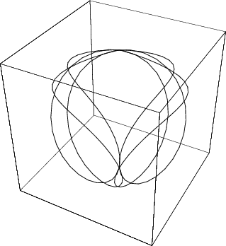 Esféricas de Steiffert ![]() La curva esférica obtuvo al moverse a lo largo de la superficie de una esfera con velocidad constante, mientras que mantenía una velocidad angular constante con respecto a un diámetro fijo (Erdos 2000). Esta curva es dada en coordenadas cilíndricos por las ecuaciones paramétricas donde Erdos (2000) proporciona una derivación de las ecuaciones de esta curva, así como un análisis de sus características, incluyendo las condiciones para obtener órbitas periódicas. ![]() ![]()