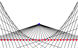 Por ejemplo, la podaria de una parabola con respecto a su foco es una linea recta, como se muestra en la siguiente figura: ![]() Inversamente, la podaria negativa de una recta con respecto a un punto es una parabola con foco el mismo punto, como se muestra en la siguiente figura: ![]()